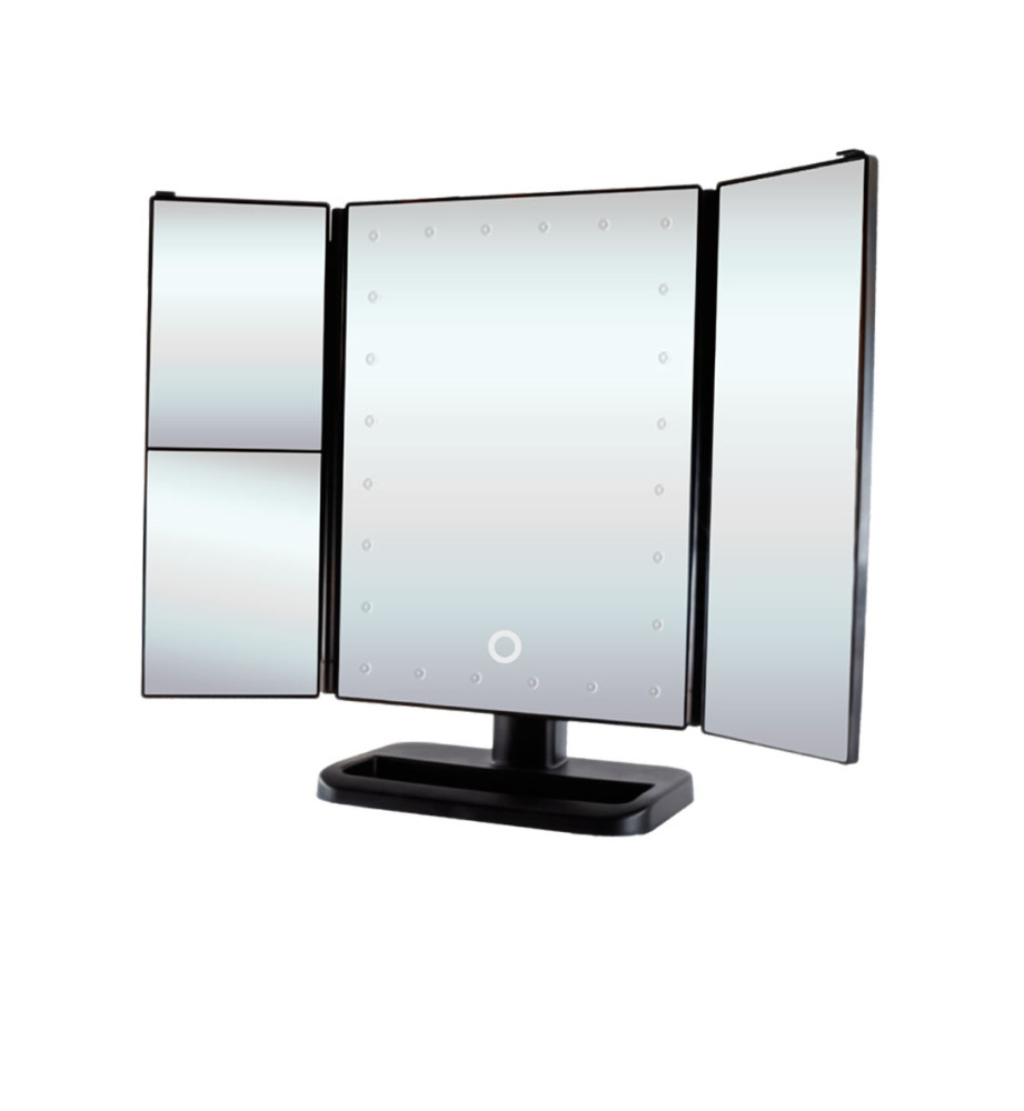 Настоящая мини-студия для макияжа – настольное складное трехстворчатое зеркало с подсветкой. С таким зеркалом вы сможете увидеть себя со всех сторон и создать неповторимый образ за считанные минуты. У зеркала светодиодная подсветка из 24 LED ламп, боковые створки с увеличением в 1, 2 и 3 раза. Удобная подставка легко поворачивается на 180 градусов, позволяя установить необходимый ракурс. В сложенном виде ширина зеркала составляет 19.5 см, в разложенном 38 см. Есть сенсорная кнопка регулирования яркости подсветки на зеркальной панели. Зеркало работает как от USB, так и от батареек.